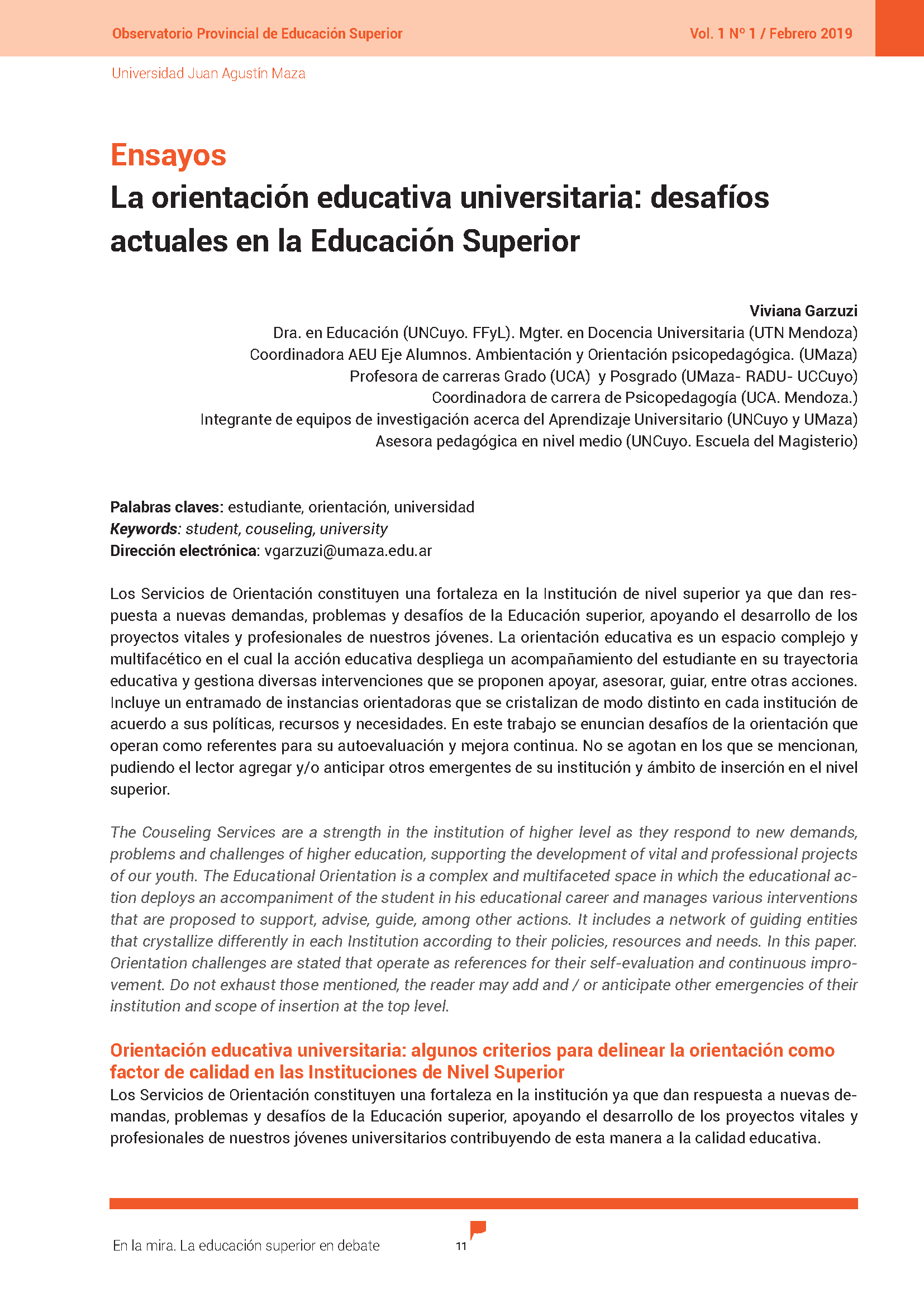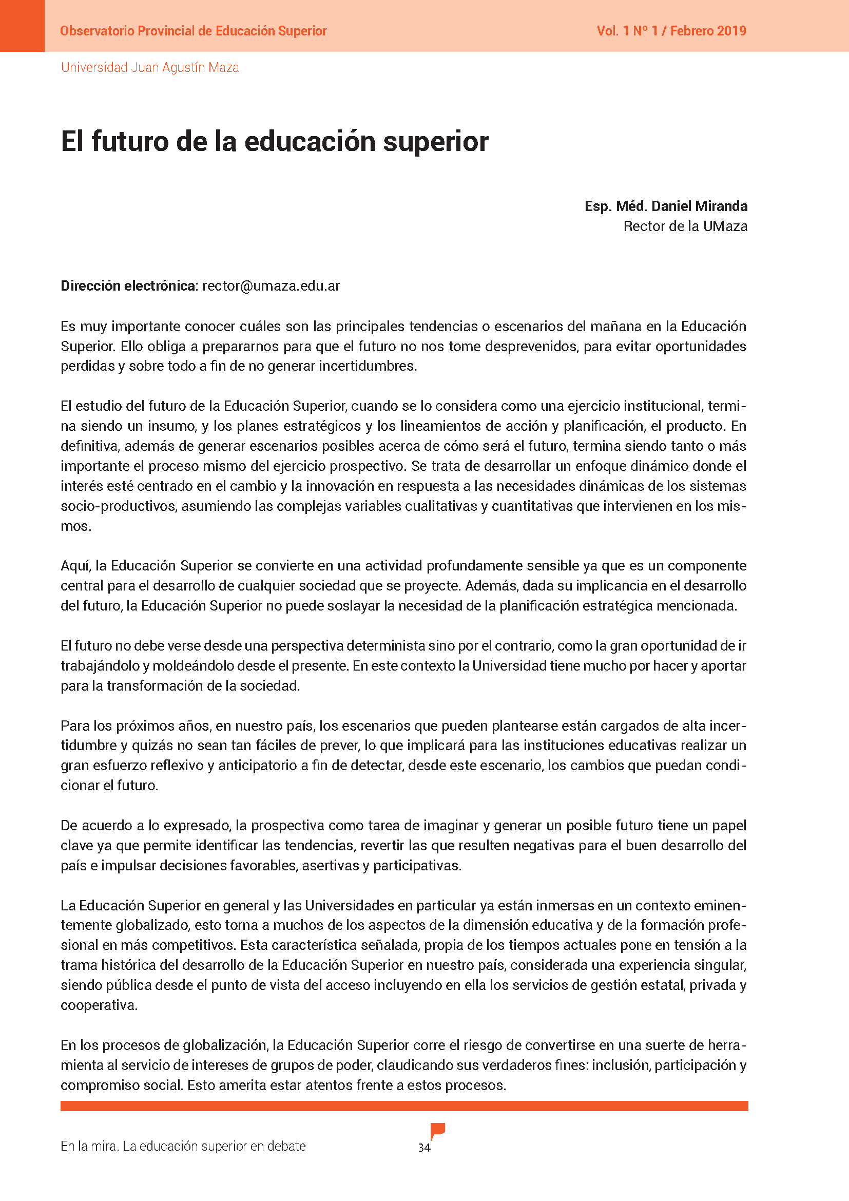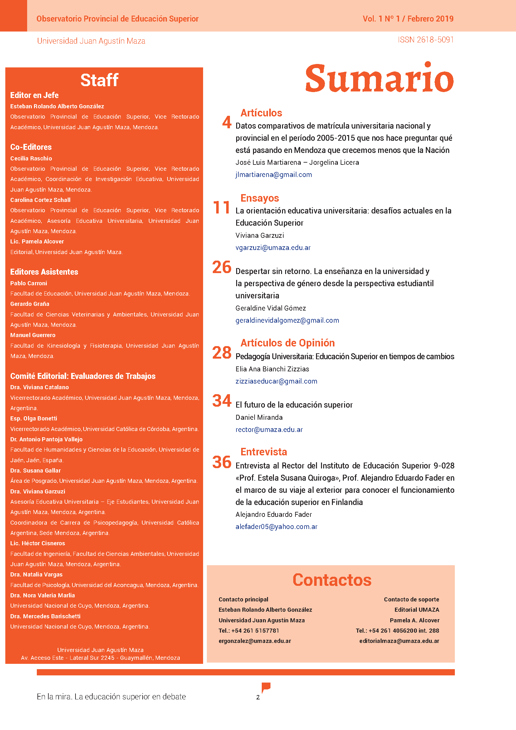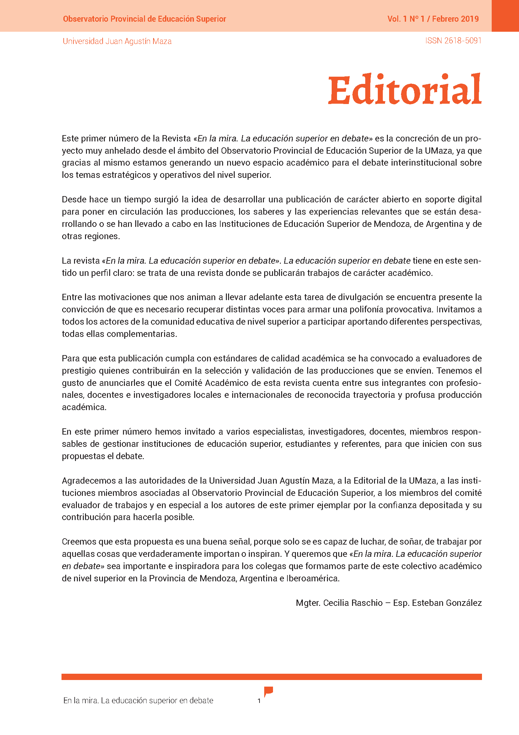 Este primer número de la Revista <<En la mira. La educación superior en debate>> es la concreción de un proyecto muy anhelado desde el ámbito del Observatorio Provincial de Educación Superior de la UMaza, ya que gracias al mismo estamos generando un nuevo espacio académico para el debate interinstitucional sobre los temas estratégicos y operativos del nivel superior.