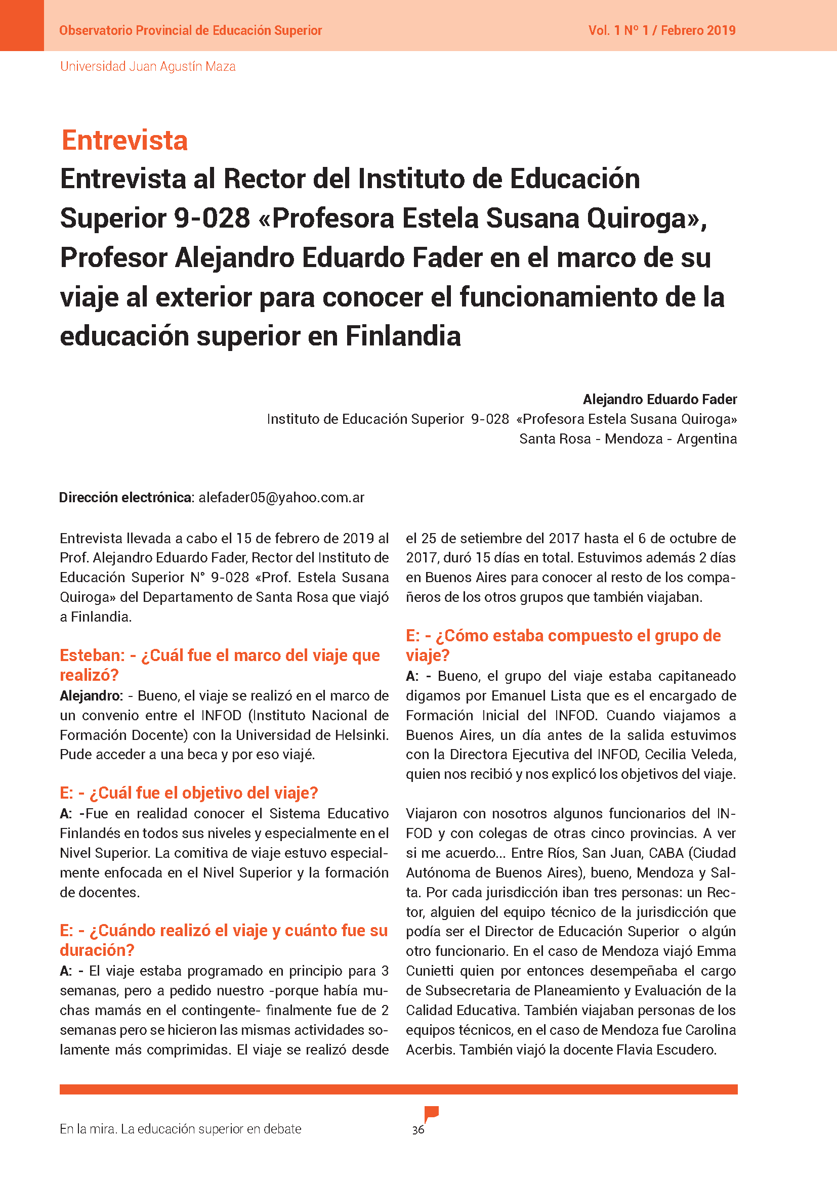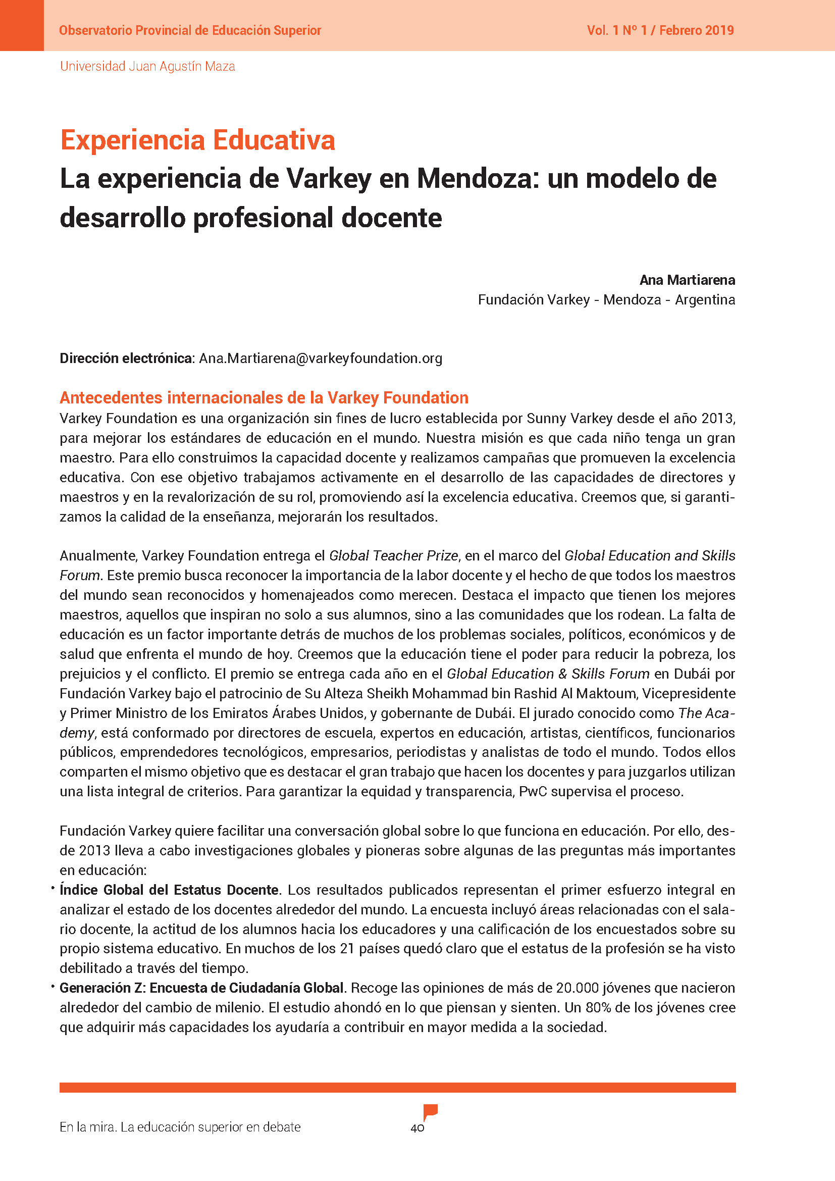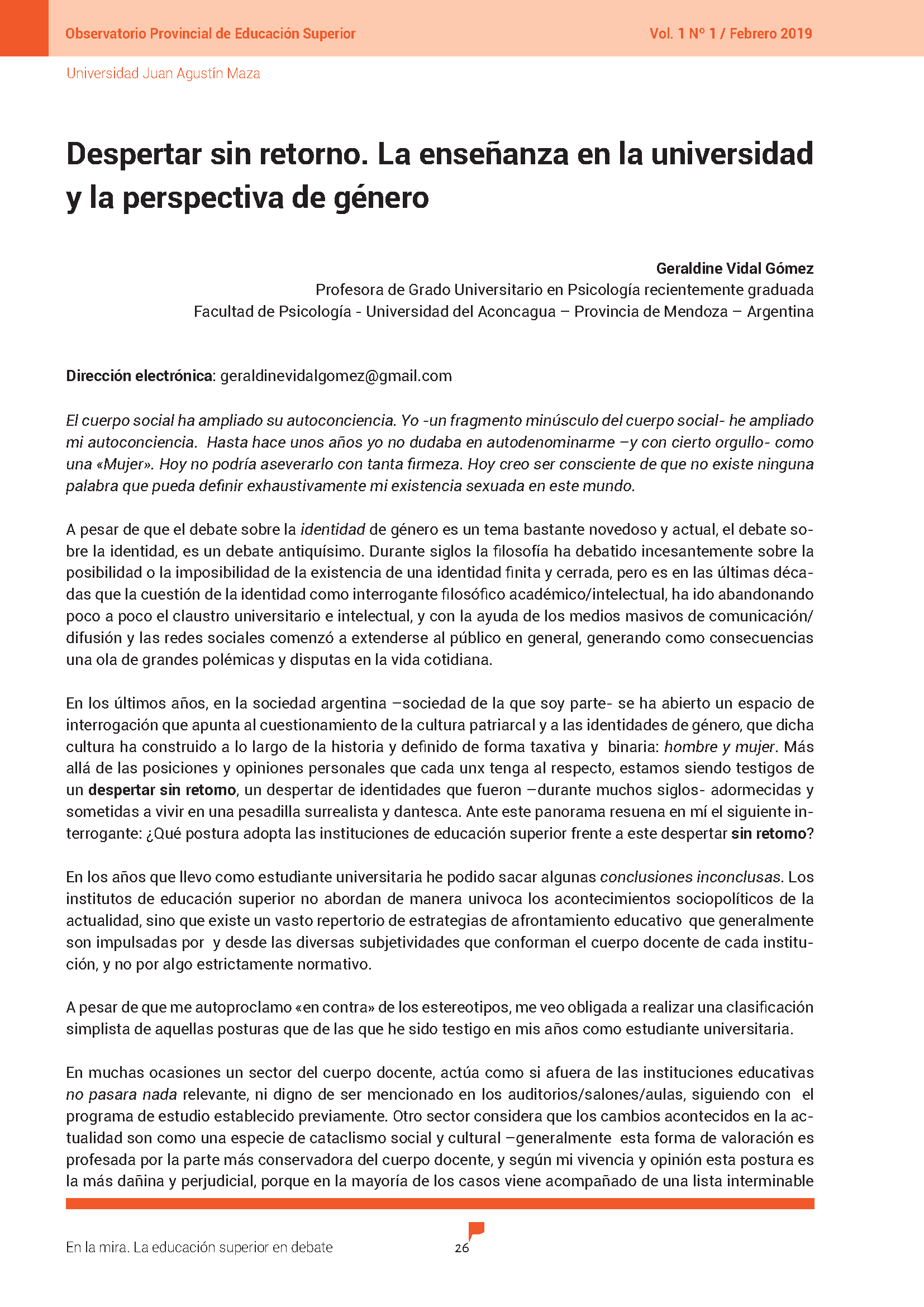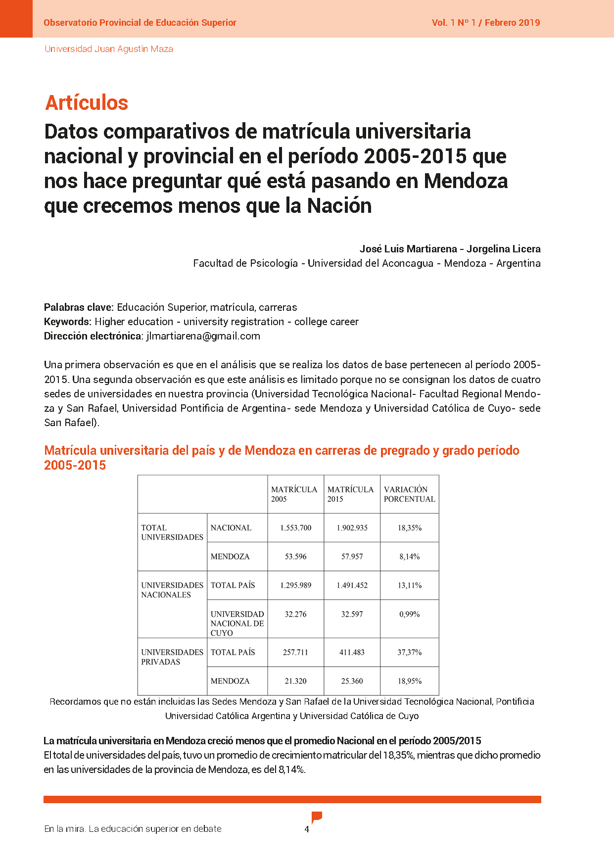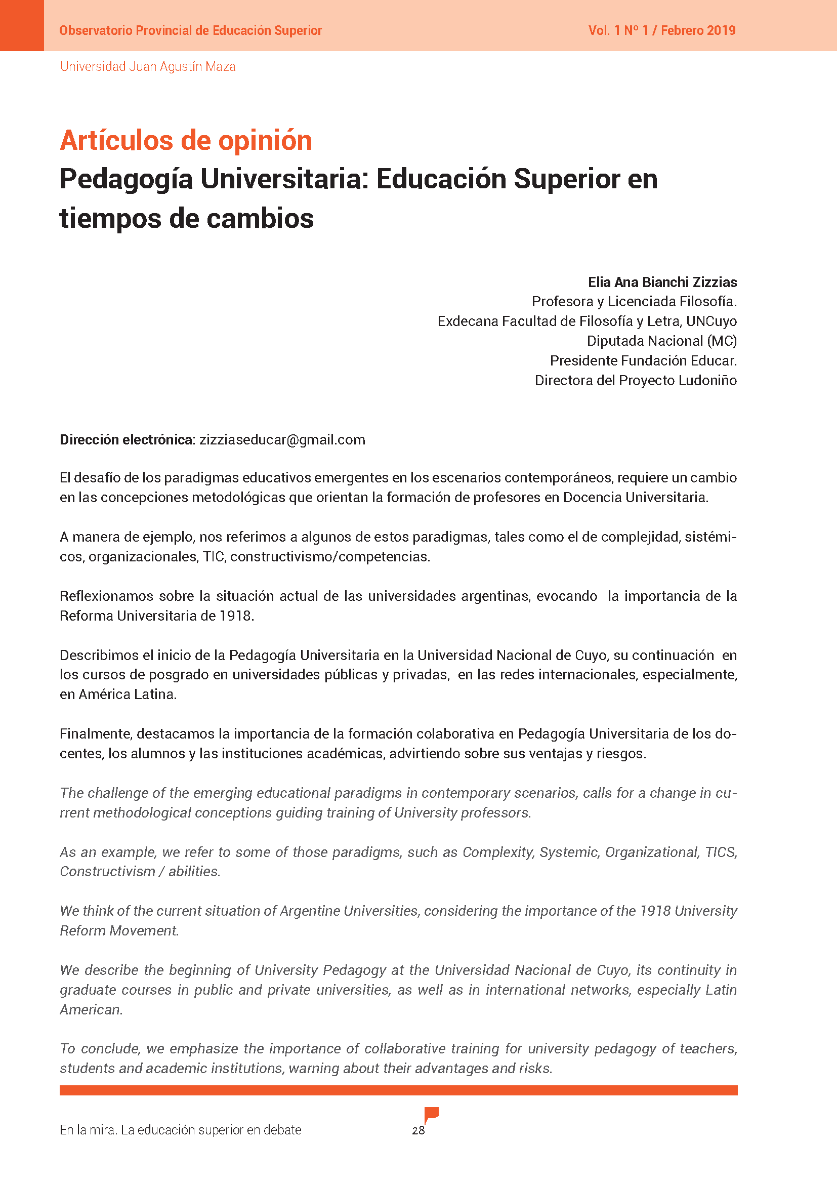 Este primer número de la Revista <<En la mira. La educación superior en debate>> es la concreción de un proyecto muy anhelado desde el ámbito del Observatorio Provincial de Educación Superior de la UMaza, ya que gracias al mismo estamos generando un nuevo espacio académico para el debate interinstitucional sobre los temas estratégicos y operativos del nivel superior.