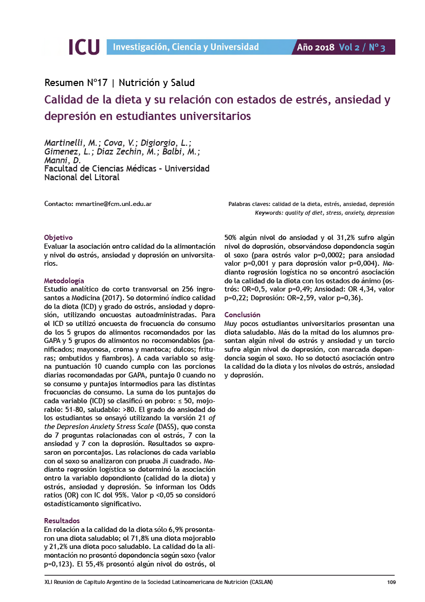 Martinelli, M., Cova, V., Digiorgio, L., Gimenez, L., Díaz Zechin, M., Balbi, M., & Manni, D. (2018). Calidad de la dieta y su relación con estados de estrés, ansiedad y depresión en estudiantes universitarios. Investigación Ciencia Y Universidad, 2(3), 109. Recuperado a partir de https://www.repositorio.umaza.edu.ar/icu/article/view/107