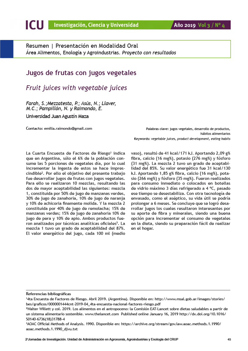 Farah, S., Asús, N., Mezzatesta, P., Llaver, M. C., Pampillón, N., & Raimondo, E. (2020). Jugos de frutas con jugos vegetales: Fruit juices with vegetable juices. Investigación Ciencia Y Universidad, 3(4), 45. Recuperado a partir de https://www.repositorio.umaza.edu.ar/icu/article/view/228