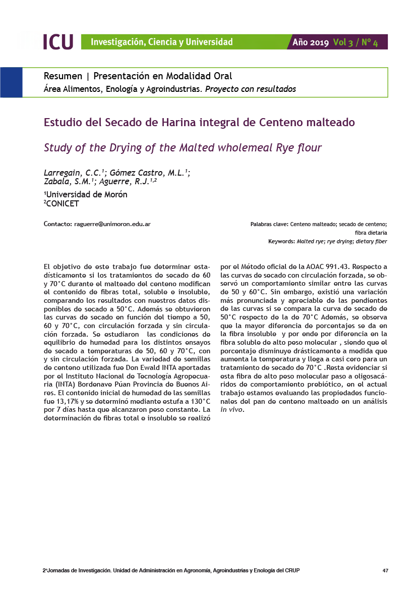 El objetivo de este trabajo fue determinar estadísticamente si los tratamientos de secado de 60 y 70°C durante el malteado del centeno modifican el contenido de fibras total, soluble e insoluble, comparando los resultados con nuestros datos disponibles de secado a 50°C. Además se obtuvieron las curvas de secado en función del tiempo a 50, 60 y 70°C, con circulación forzada y sin circulación forzada. Se estudiaron las condiciones de equilibrio de humedad para los distintos ensayos de secado a temperaturas de 50, 60 y 70°C, con y sin circulación forzada. La variedad de semillas de centeno utilizada fue Don Ewald INTA aportadas por el Instituto Nacional de Tecnología Agropecuaria (INTA) Bordenave Púan Provincia de Buenos Aires.