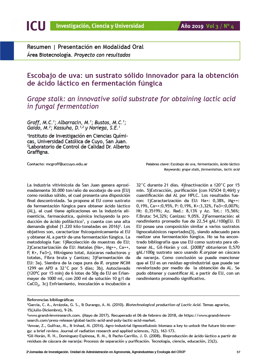 La industria vitivinícola de San Juan genera aproximadamente 30.000 ton/año de escobajo de uva (EU) como residuo sólido, el cual presenta una disposición final descontrolada. Se propone al EU como sustrato de fermentación fúngica para obtener ácido láctico (AL), el cual tiene aplicaciones en la industria alimenticia, farmacéutica, química incluyendo la producción de ácido poliláctico1, y cuenta con una alta demanda global (1.220 kilo-toneladas en 2016)2. Los objetivos son, caracterizar fisicoquímicamente al EU y obtener AL a partir de una fermentación fúngica. La metodología fue: 1)Recolección de muestras de EU; 2)Caracterización de EU: Metales (Na+, Mg++, Ca++, P, K+, Fe3+), Nitrógeno total, Azúcares reductores y totales, Fibra bruta y Cenizas; 3)Fermentación de EU: 3a). Siembra de la cepa pura de R. oryzae NCIM 1299 en APD a 32°C por 5 días; 3b). Autoclavado (120ºC por 15 min) de 6 lotes de 50g de EU en Erlenmeyer de 1000 ml, con 200 ml de solución 10 g/l de CaCO3, 3c) Enfriamiento, inoculación e incubación a 32°C durante 21 días. 4)Inactivación a 120°C por 15 min. 5)Extracción, purificación (con H2SO4 0,46N) y cuantificación del AL por HPLC. Los resultados fueron: 1)Caracterización de EU: Na+: 0,38%, Mg++: 0,19%, Ca++:0,95%, P: 0,19%, K+:3,32%, Fe3+:0,007%; Nt: 0,3519%; Az. Red.: 8,13% y Az. Tot.: 15,56%; F.Bruta: 54,32%; Cenizas: 9,05%. 2)Fermentación: el rendimiento promedio fue de 22,54 gAL/100gEU. El EU posee una composición similar a varios sustratos lignocelulósicos reportados(3), siendo adecuado para realizar una fermentación fúngica. No se ha encontrado bibliografía que use EU como sustrato para obtener AL, Gil-Horán y col. (2008)4 obtuvieron 0,570 gAL/100g sustrato seco usando R.oryzae en cáscara de naranja. Como conclusión se puede mencionar que el EU es un residuo agroindustrial que puede ser revalorizado por medio de  la obtención de AL. Se pudo obtener y cuantificar AL a partir de EU, con un rendimiento promedio significativo.