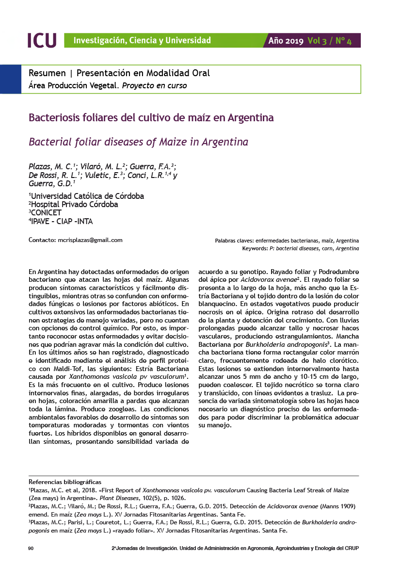 Plazas, M. C., Vilaró, M. L., Guerra, F. A., De Rossi, R. L., Vuletic, E., Conci, L. R., & Guerra, G. D. (2020). Bacteriosis foliares del cultivo de maíz en Argentina: Bacterial foliar diseases of Maize in Argentina. Investigación Ciencia Y Universidad, 3(4), 90. Recuperado a partir de https://www.repositorio.umaza.edu.ar/icu/article/view/285