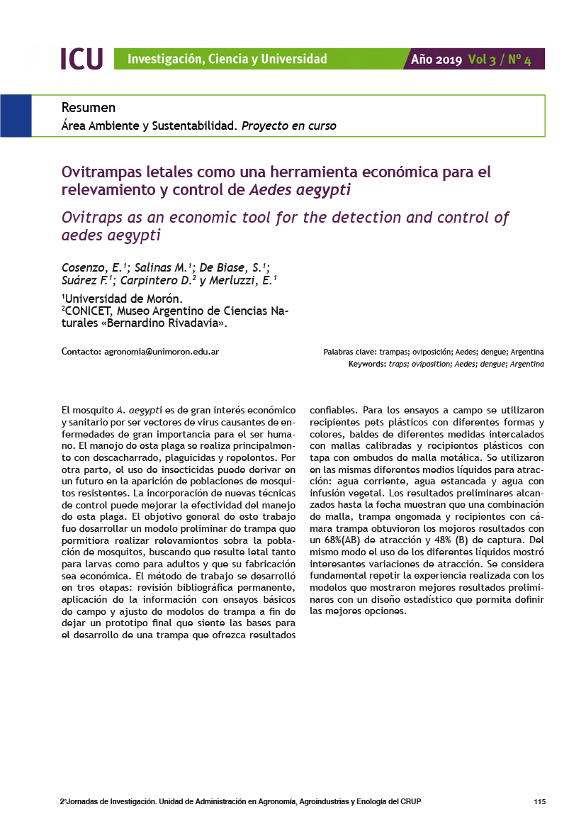 El mosquito A. aegypti es de gran interés económico y sanitario por ser vectores de virus causantes de enfermedades de gran importancia para el ser humano. El manejo de esta plaga se realiza principalmente con descacharrado, plaguicidas y repelentes. Por otra parte, el uso de insecticidas puede derivar en un futuro en la aparición de poblaciones de mosquitos resistentes. La incorporación de nuevas técnicas de control puede mejorar la efectividad del manejo de esta plaga. El objetivo general de este trabajo fue desarrollar un modelo preliminar de trampa que permitiera realizar relevamientos sobra la población de mosquitos, buscando que resulte letal tanto para larvas como para adultos y que su fabricación sea económica. El método de trabajo se desarrolló en tres etapas: revisión bibliográfica permanente, aplicación de la información con ensayos básicos de campo y ajuste de modelos de trampa a fin de dejar un prototipo final que siente las bases para el desarrollo de una trampa que ofrezca resultados confiables. Para los ensayos a campo se utilizaron recipientes pets plásticos con diferentes formas y colores, baldes de diferentes medidas intercalados con mallas calibradas y recipientes plásticos con tapa con embudos de malla metálica. Se utilizaron en las mismas diferentes medios líquidos para atracción: agua corriente, agua estancada y agua con infusión vegetal. Los resultados preliminares alcanzados hasta la fecha muestran que una combinación de malla, trampa engomada y recipientes con cámara trampa obtuvieron los mejores resultados con un 68%(AB) de atracción y 48% (B) de captura. Del mismo modo el uso de los diferentes líquidos mostró interesantes variaciones de atracción. Se considera fundamental repetir la experiencia realizada con los modelos que mostraron mejores resultados preliminares con un diseño estadístico que permita definir las mejores opciones.