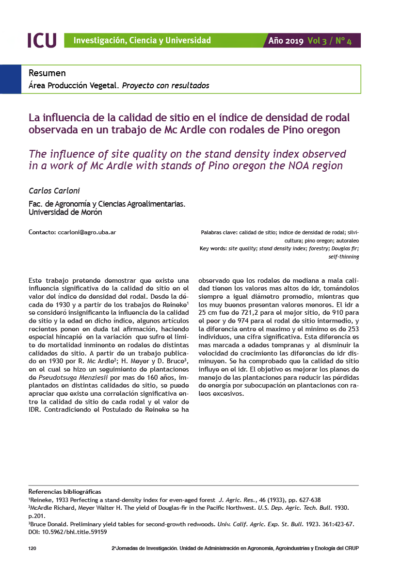 Este trabajo pretende demostrar que existe una influencia significativa de la calidad de sitio en el valor del índice de densidad del rodal. Desde la década de 1930 y a partir de los trabajos de Reineke se consideró insignificante la influencia de la calidad de sitio y la edad en dicho índice, algunos artículos recientes ponen en duda tal afirmación, haciendo especial hincapié en la variación que sufre el limite de mortalidad inminente en rodales de distintas calidades de sitio. A partir de un trabajo publicado en 1930 por R. Mc Ardle; H. Meyer y D. Bruce, en el cual se hizo un seguimiento de plantaciones de Pseudotsuga Menziesii por mas de 160 años, implantados en distintas calidades de sitio, se puede apreciar que existe una correlación significativa entre la calidad de sitio de cada rodal y el valor de IDR. Contradiciendo el Postulado de Reineke se ha observado que los rodales de mediana a mala calidad tienen los valores mas altos de idr, tomándolos siempre a igual diámetro promedio, mientras que los muy buenos presentan valores menores. El idr a 25 cm fue de 721,2 para el mejor sitio, de 910 para el peor y de 974 para el rodal de sitio intermedio, y la diferencia entre el maximo y el minimo es de 253 individuos, una cifra significativa. Esta diferencia es mas marcada a edades tempranas y al disminuir la velocidad de crecimiento las diferencias de idr disminuyen.