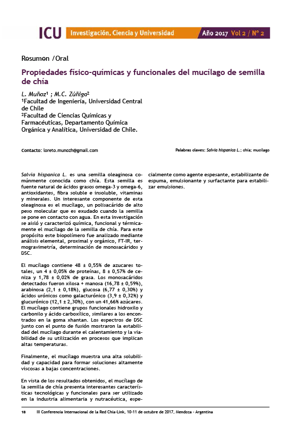 Salvia hispanica L. es una semilla oleaginosa comúnmente conocida como chía. Esta semilla es fuente natural de ácidos grasos omega-3 y omega-6, antioxidantes, fibra soluble e insoluble, vitaminas y minerales. Un interesante componente de esta oleaginosa es el mucílago, un polisacárido de alto peso molecular que es exudado cuando la semilla se pone en contacto con agua. En esta investigación se aisló y caracterizó química, funcional y térmicamente el mucílago de la semilla de chía. Para este propósito este biopolímero fue analizado mediante análisis elemental, proximal y orgánico, FT-IR, termogravimetría, determinación de monosacáridos y DSC.