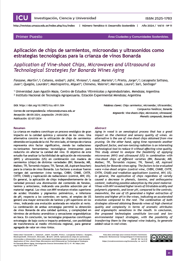 La crianza en madera constituye un proceso enológico de gran impacto en la calidad química y sensorial de los vinos. Una alternativa consiste en la utilización de chips de sarmientos obtenidos en la poda de la vid. Por otro lado, el tiempo de crianza representa otro factor significativo, siendo las radiaciones no-ionizantes herramientas tecnológicas interesantes para reducirlo sin afectar la calidad del vino. El objetivo de este estudio fue analizar la factibilidad de aplicación de microondas (MW) y ultrasonidos (US) en combinación con madera de sarmientos (chips) de distintas variedades (BN, Bonarda; MB, Malbec; TR, Torrontés riojano; TN, Tannat; AB, Aspirant bouchet) para la crianza de vinos Bonarda. Los factores a evaluar fueron “origen del sarmiento” (vino testigo, CHBN, CHMB, CHTR, CHTN, CHAB) y “aplicación de radiaciones” (control, MW, US). En general, la aplicación de chips independientemente de la variedad provocó una disminución del contenido de fenoles, taninos y antocianos, indicando una posible adsorción por el material vegetal. Los vinos con MW revelaron niveles superiores de acidez titulable y pigmentos poliméricos, e inferiores de pH, respecto a los controles; en tanto, el empleo de US generó una mayor extracción de taninos y pH superiores en los vinos, indicando una evolución acelerada en relación al resto. La combinación de ambas estrategias permitió la obtención de vinos Bonarda de alta calidad química, y complejidad en términos de atributos aromáticos y sensaciones organolépticas en boca. En conclusión, las tecnologías propuestas constituyen estrategias de bajo costo e impacto ambiental, con posibilidad de transferencia al medio vitivinícola regional, para generar agregado de valor en vinos tintos.