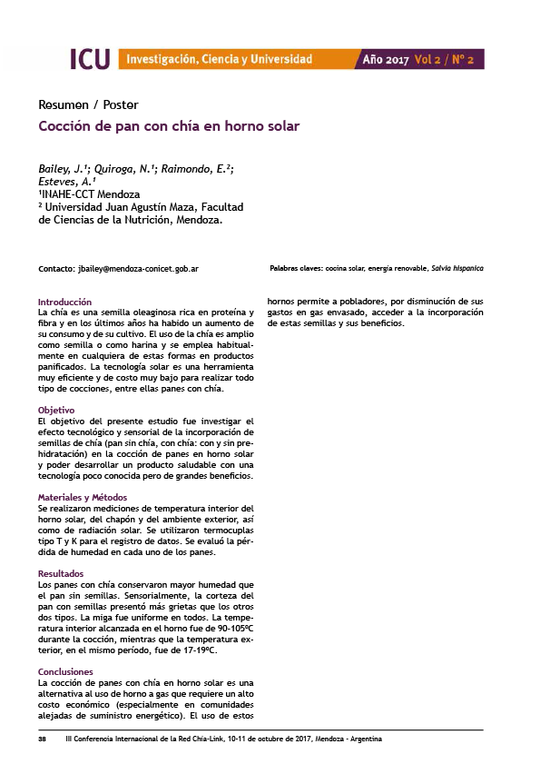 La chía es una semilla oleaginosa rica en proteína y fibra y en los últimos años ha habido un aumento de su consumo y de su cultivo. El uso de la chía es amplio como semilla o como harina y se emplea habitualmente en cualquiera de estas formas en productos panificados. La tecnología solar es una herramienta muy eficiente y de costo muy bajo para realizar todo tipo de cocciones, entre ellas panes con chía.