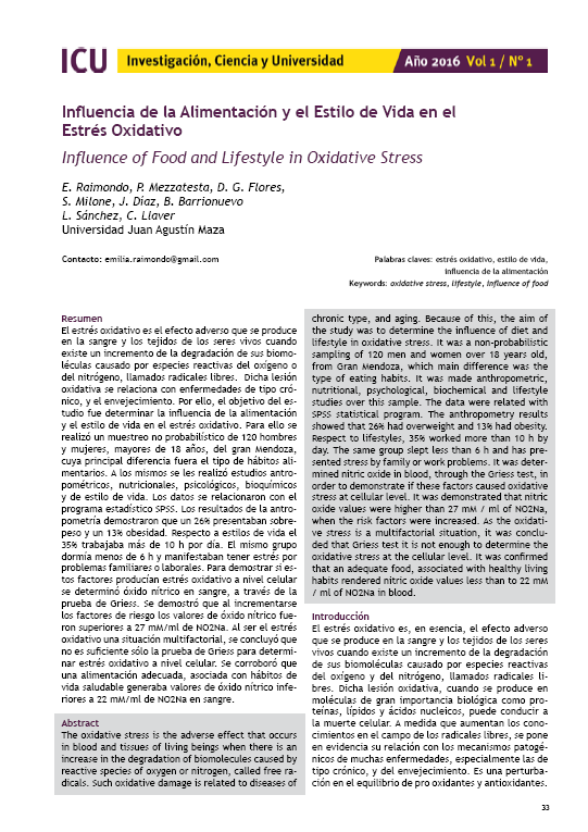 El estrés oxidativo es el efecto adverso que se produce en la sangre y los tejidos de los seres vivos cuando existe un incremento de la degradación de sus biomoléculas causado por especies reactivas del oxígeno o del nitrógeno, llamados radicales libres. Dicha lesión oxidativa se relaciona con enfermedades de tipo crónico, y el envejecimiento. Por ello, el objetivo del estudio fue determinar la influencia de la alimentación y el estilo de vida en el estrés oxidativo. Para ello se realizó un muestreo no probabilístico de 120 hombres y mujeres, mayores de 18 años, del gran Mendoza, cuya principal diferencia fuera el tipo de hábitos alimentarios. A los mismos se les realizó estudios antropométricos, nutricionales, psicológicos, bioquímicos y de estilo de vida. Los datos se relacionaron con el programa estadístico SPSS. Los resultados de la antropometría demostraron que un 26% presentaban sobrepeso y un 13% obesidad. Respecto a estilos de vida el 35% trabajaba más de 10 h por día. El mismo grupo dormía menos de 6 h y manifestaban tener estrés por problemas familiares o laborales. Para demostrar si estos factores producían estrés oxidativo a nivel celular se determinó óxido nítrico en sangre, a través de la prueba de Griess. Se demostró que al incrementarse los factores de riesgo los valores de óxido nítrico fueron superiores a 27 mM/ml de NO2Na. Al ser el estrés oxidativo una situación multifactorial, se concluyó que no es suficiente sólo la prueba de Griess para determinar estrés oxidativo a nivel celular. Se corroboró que una alimentación adecuada, asociada con hábitos de vida saludable generaba valores de óxido nítrico inferiores a 22 mM/ml de NO2Na en sangre.