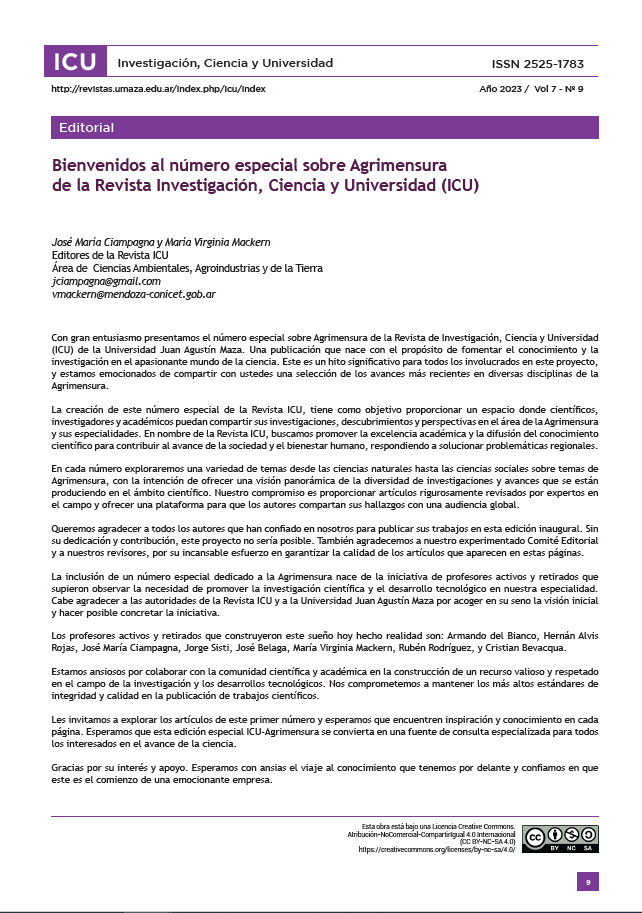 En 2023 la Revista ICU inaugura un Número Especial con la temática Agrimensura. Una publicación que nace con el propósito de fomentar el conocimiento y la investigación en el apasionante mundo de la ciencia en esta disciplina específica. Este es un hito significativo para todos los involucrados en este proyecto, y estamos emocionados de compartir con ustedes una selección de los avances más recientes en el campo de la Agrimensura.