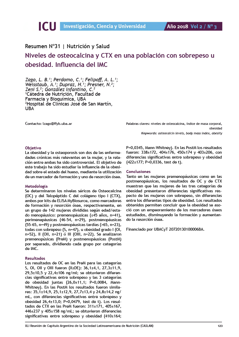 Zago, L. B., Perdomo, C., Felipoff, A. L., Weisstaub, A., Dupraz, A., Presner, N., … González Infantino, C. (2018). Niveles de osteocalcina y CTX en una población con sobrepeso u obesidad. Influencia del IMC. Investigación Ciencia Y Universidad, 2(3), 123. https://doi.org/10.59872/icu.v2i3.123