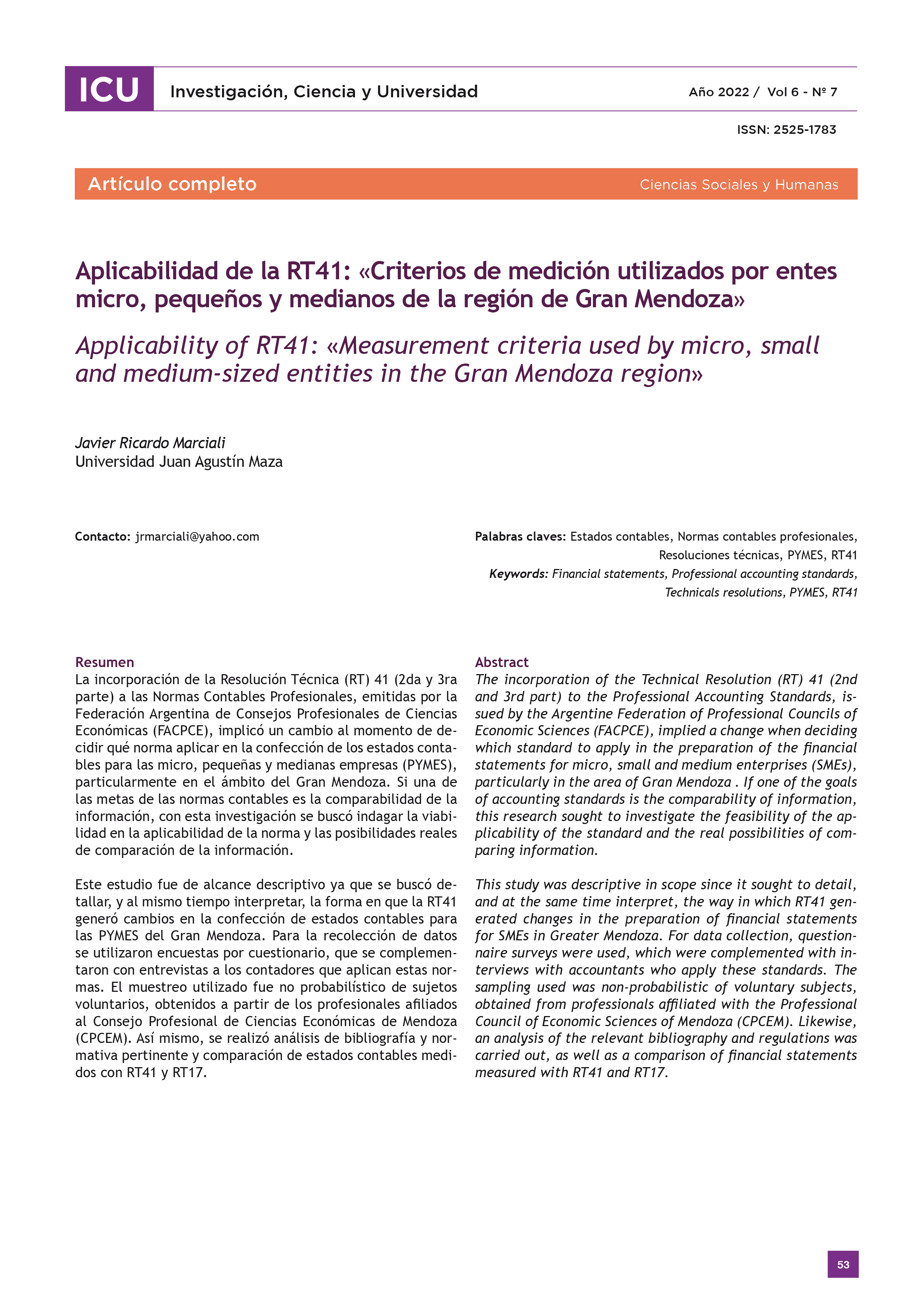 Marciali, J. (2022). Aplicabilidad de la Resolución Técnica 41: «Criterios de medición utilizados por entes micro, pequeños y medianos de la región de Gran Mendoza».: Applicability of Technical Resolution 41: «Measurement criteria used by micro, small and medium-sized entities in the Gran Mendoza region». Investigación Ciencia Y Universidad, 6(7). https://doi.org/10.59872/icu.v6i7.403