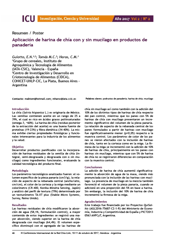 La chía (Salvia hispanica L.) es originaria de México. Las semillas contienen aceite en un rango de 25 a 39%, el cual es rico en ácidos grasos poliinsaturados (omega-3, ~60%). La harina de chía (residuo posterior de la extracción del aceite) es una buena fuente de proteínas (19-23%) y fibra dietética (34-40%). La misma exhibe ciertas propiedades fisiológicas y funcionales interesantes para la industria de los alimentos y la salud.